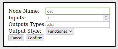 The controls of this dialog are explained as follows: 1. The node name field is where you can input a name for the node you wish to create. 2. The inputs field is where you specify the number of inputs your node will accept. 3. The output types field is where you specify the number and types of outputs of your node. The outputs of a node are specified in a comma separated list containing the csound variable prefix pertaining to the type of each output. For example, if you create outputs as shown in the figure above the result will be a node with an a-rate, k-rate and i-rate output (in that order). 4. The output style dropdown is where you can choose between functional and macro mode for the given node. 5. The cancel button closes the node config dialog. 6. The okay button confirms the node being configured. After clicking confirm the graph canvas is configured so that the node you designed in the node config can now be input into your graph the next time you right click in node mode in the canvas. You should also see the text at the top right of the canvas has changed to reflect your inputs in the node config.