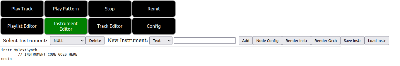 To create a new instrument using the text mode interface, as described above, we can input a name such as “MyTextSynth” into the text field, select “Text” from the drop down and click the “Add” button. Doing this results in the following interface.