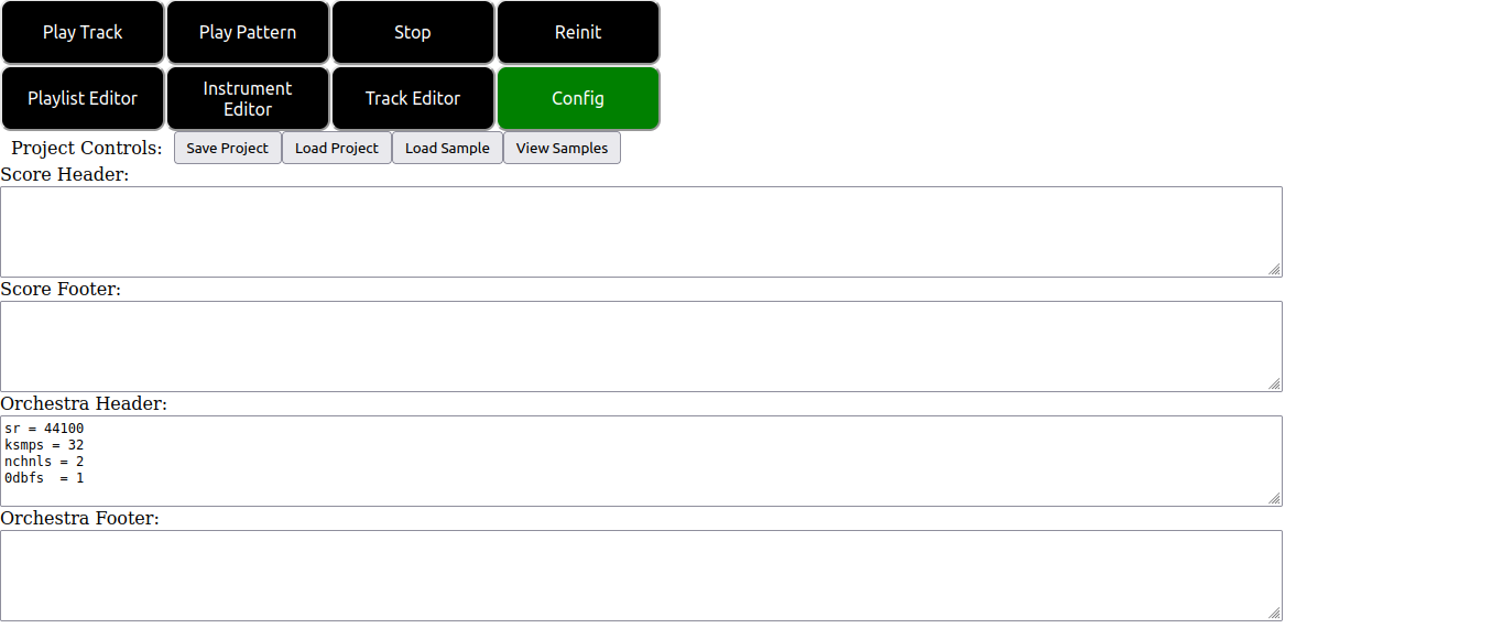 - Before loading or saving a project the csound backend must be initialized. This can be done by pressing the “Reinit” button at the top right of the UI.