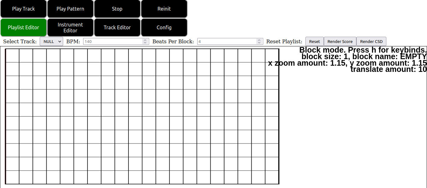 The playlist editor is used for arranging tracks created in the track editor into a cohesive musical piece. The playlist editor is also used to control the play times and render your project to a full CSD file or to render the score of your project into a full score file.