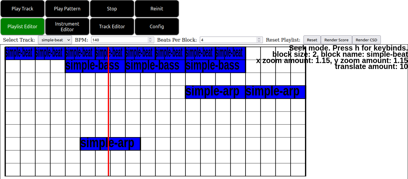 The resulting csd file of this score plays back the above patterns with appropriate offsets relative to their positions in the playlist canvas editor display. Additionally the resulting csound file has an offset setup to indicate that playback should occur at the time indicated by the red seek bar shown in the window.